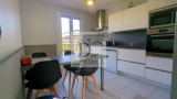 Cuisine ouverte sur un salon lumineux.